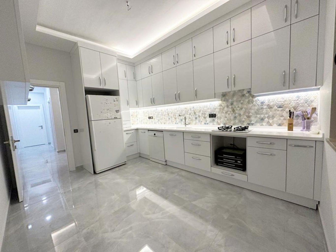Квартира площадью 142 м² находится на 1 этаже четырёхэтажного дома. Планировка включает отдельную кухню, светлую гостиную, три спальни, две ванные комнаты и два балкона. Напольное покрытие — гранитная керамика, установлены ПВХ окна с двойным стеклопакетом, стальная входная дверь и видеодомофон. Квартира идеально подходит для постоянного проживания в Аланье, отдыха у моря или инвестиций в недвижимость Турции.