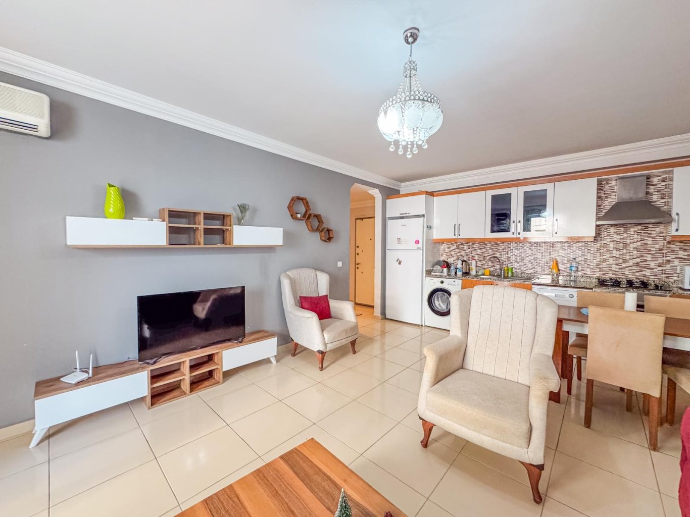 Квартира полностью готова к проживанию: в наличии вся мебель и техника, включая кондиционеры, встроенную кухню, телевизор, стиральную машину и многое другое.