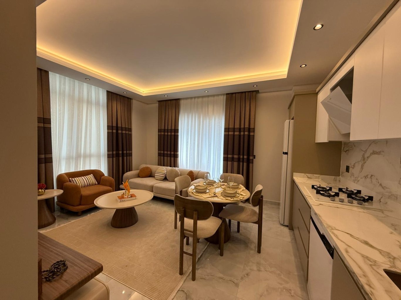 В комплексе представлены различные планировки: 1+1, 2+1, а также дуплексы 2+1 и 3+1. Квартиры спроектированы с удобными и функциональными планировками, включающими гостиную с кухней открытого типа, спальни, санузлы и балконы, что обеспечивает комфорт и высокий арендный потенциал.
